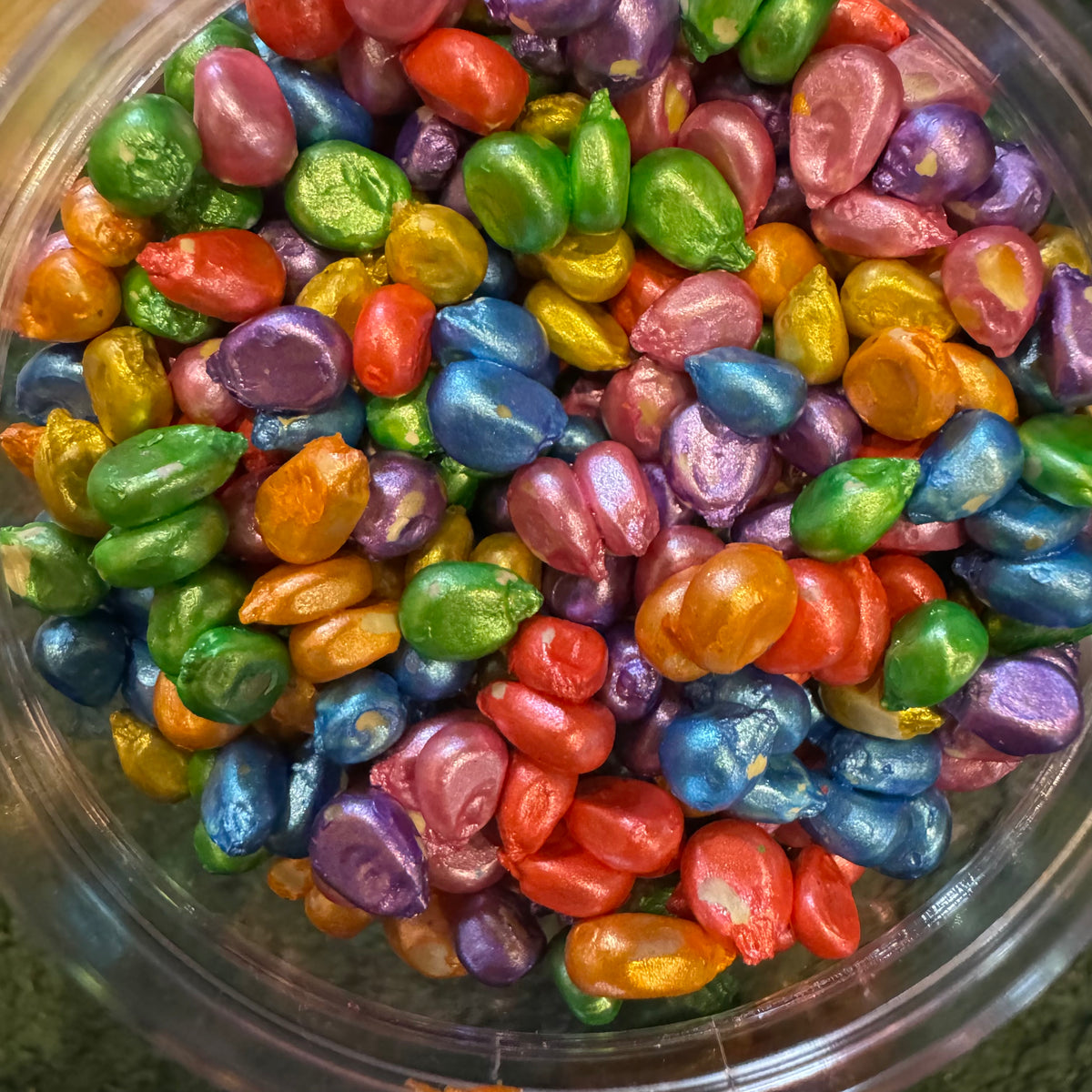 De Rainbow Maïs Mix is vervaardigd uit hoogwaardige maïs en verf, en wordt geleverd in een herbruikbare PET pot met een handig schroefdeksel.