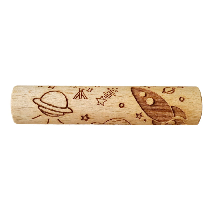 Voeg creativiteit toe aan open-ended en sensorisch spel met onze unieke houten rollers! Elke roller is een kunstwerk op zich, met zijn eigen unieke print en biedt urenlang speelplezier. Deze specifieke roller brengt een prachtig Ruimte thema tot leven in klei of Speelzand.