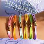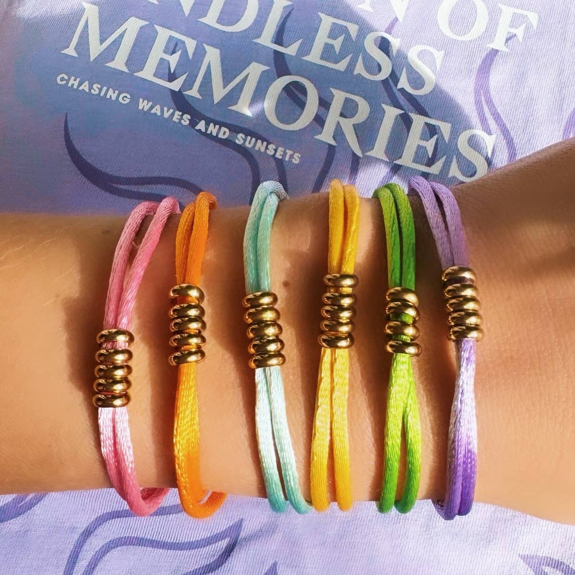 De armband is gemaakt van mint satijndraad en heeft 5 ringen van roestvrij staal. De armband is verstelbaar door middel van twee schuifknopen. Materiaal: roestvrij staal (roestvrij staal = geen verkleuring)