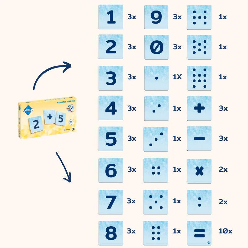 De magneet toppers hebben hetzelfde formaat als een Coblo steen en kunnen dankzij de zwarte magnetische laag aan de onderkant eenvoudig op de Coblo stenen worden geklikt; ze passen perfect. Dit maakt het spelen met Coblo nog leuker, creatiever, veelzijdiger en leerzamer. De magnetische cijfers hebben bovendien levendige kleuren die garant staan voor eindeloos plezier!