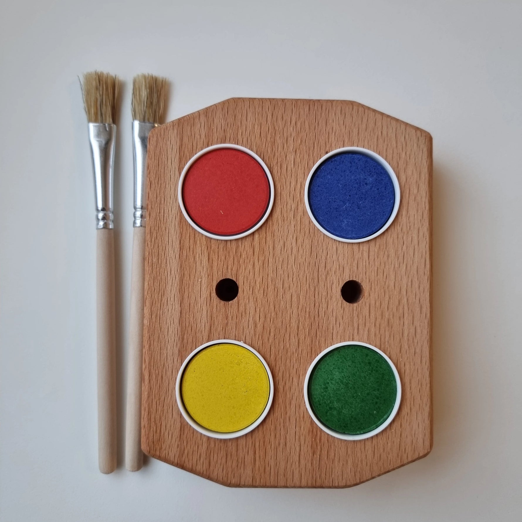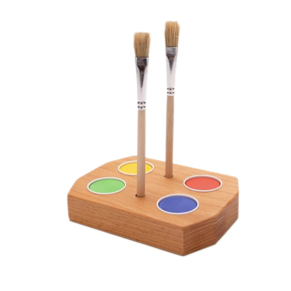 Vier kleuren in een mooi overzicht opgeruimd in één houder. De houder heeft gaten van 32 mm waar onder andere Stockmar waterverf cups perfect in passen.