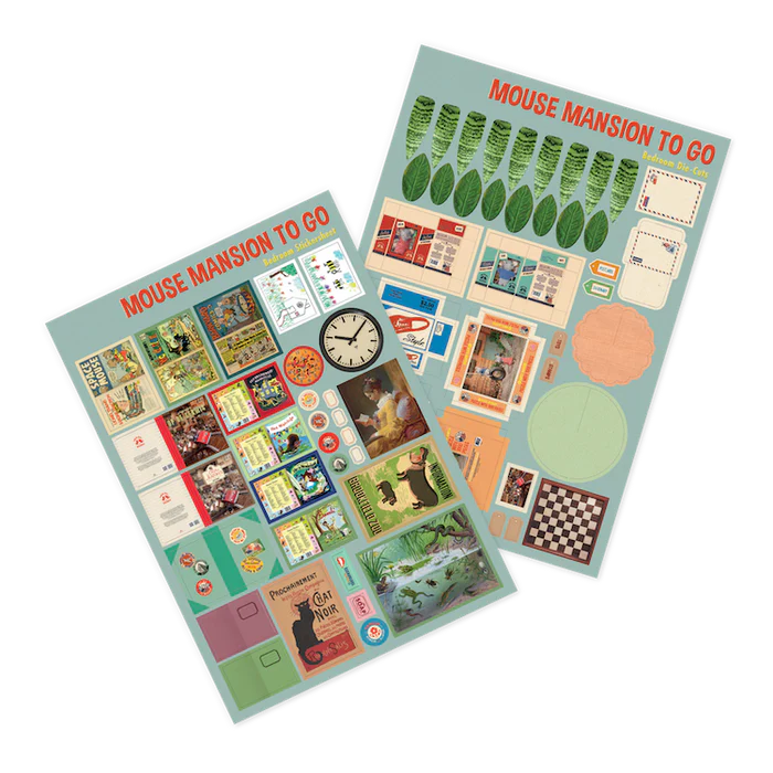 Gebruik het stickervel om je kamer te versieren en het decoratievel om papieren miniatuuraccessoires te maken, zoals lampenkappen, planten en kleine doosjes.