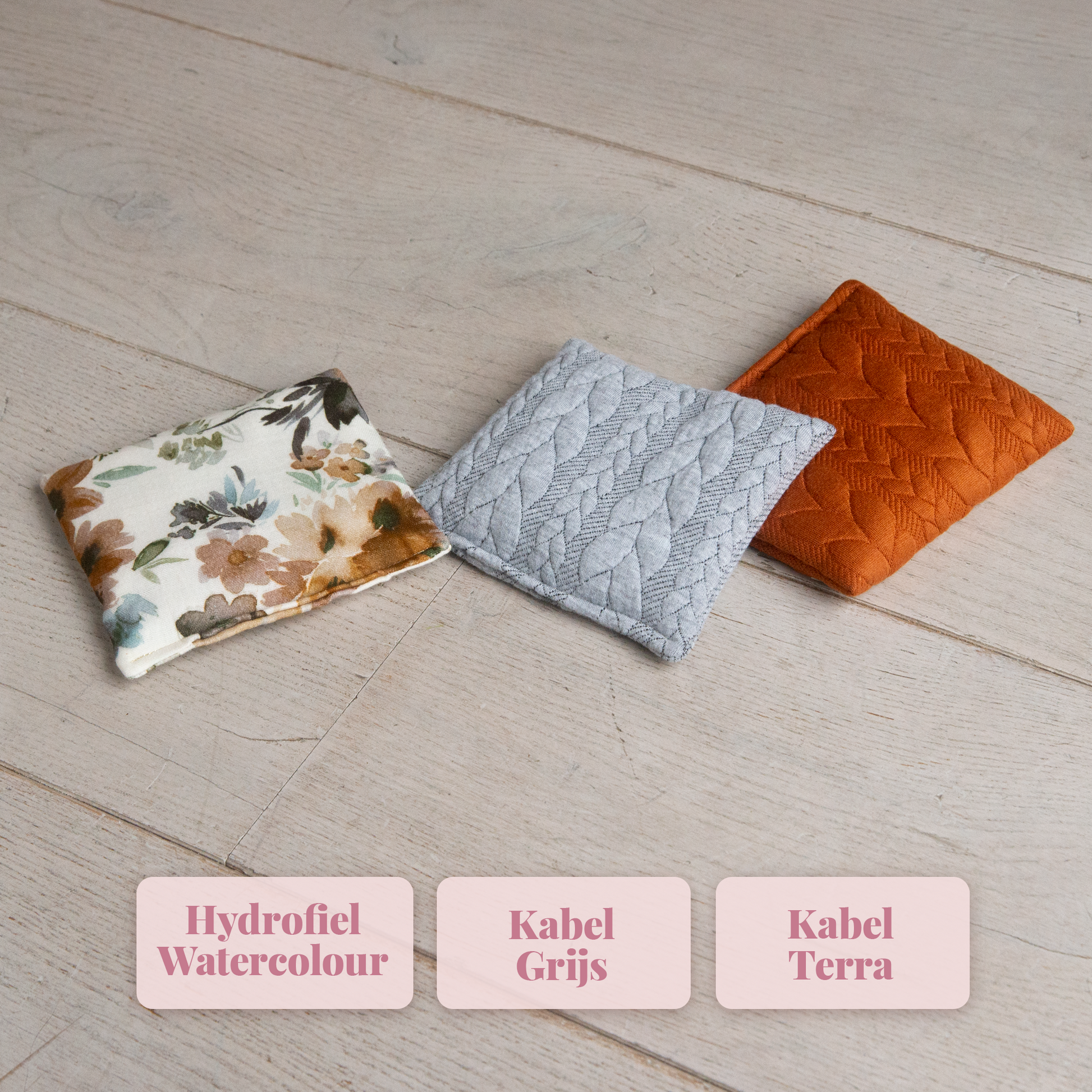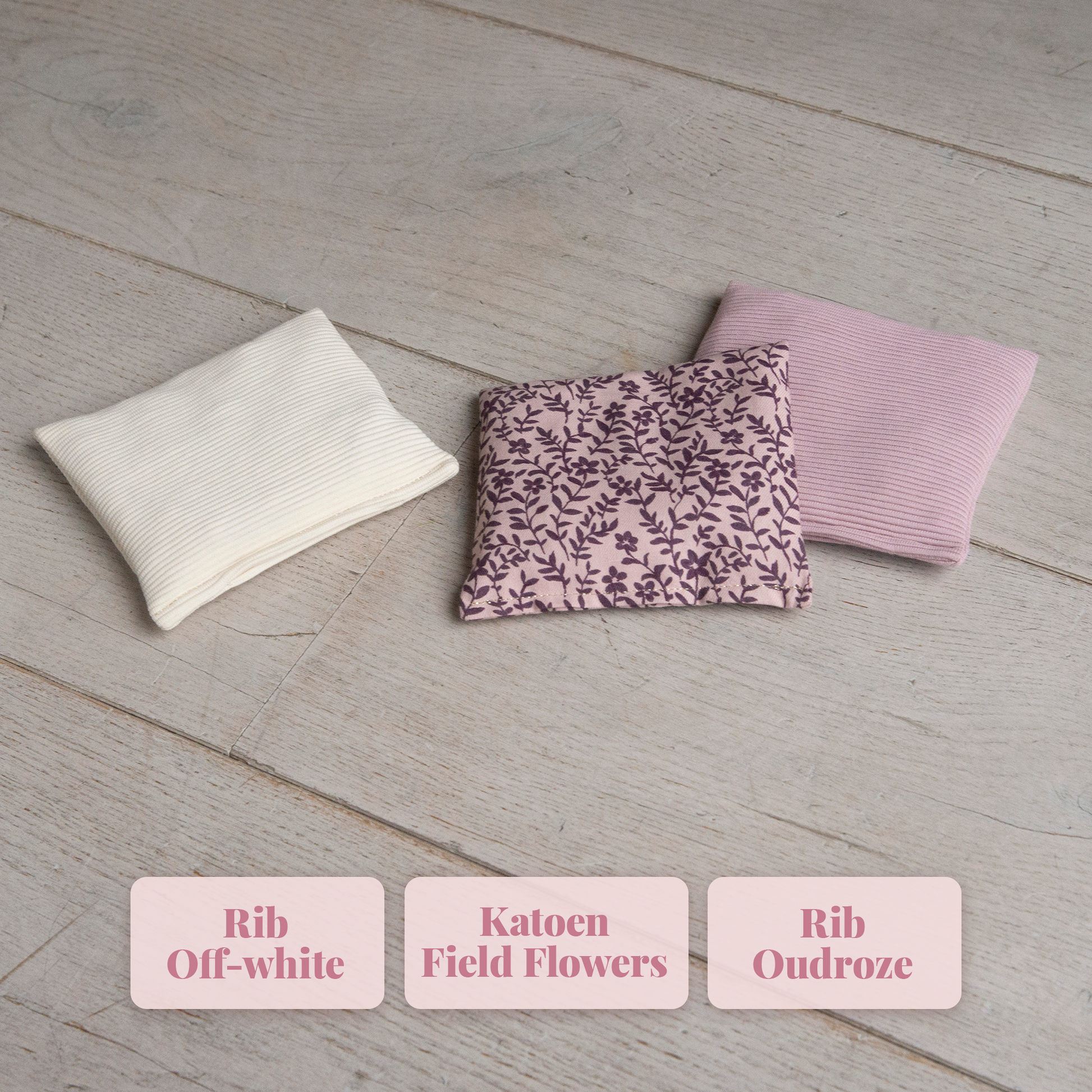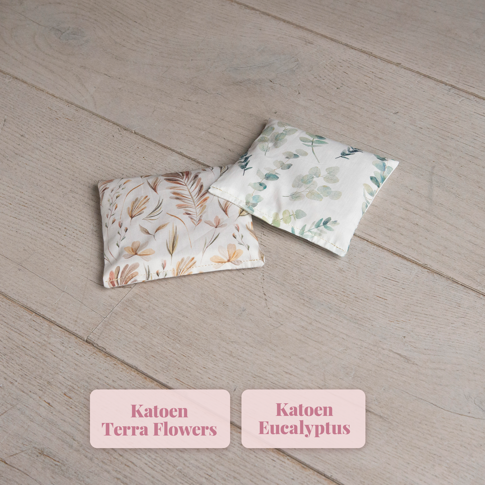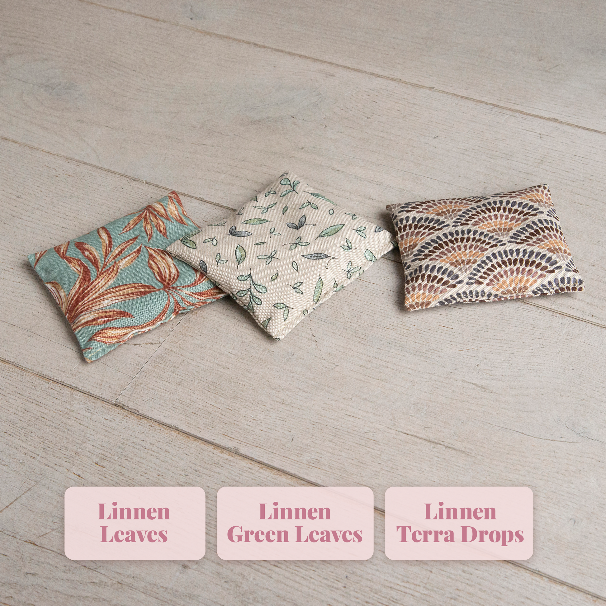 Omdat er al genoeg plastic op deze wereld is, vul ik mijn pittenzakjes met natuurlijke materialen, namelijk kersen-, druivenpitten en een mix daarvan. Voor de stoffen heb ik gekozen voor verschillende texturen en rustige botanische prints in aardetinten. Alle stoffen zijn voorzien van een OEKO-TEX keurmerk.