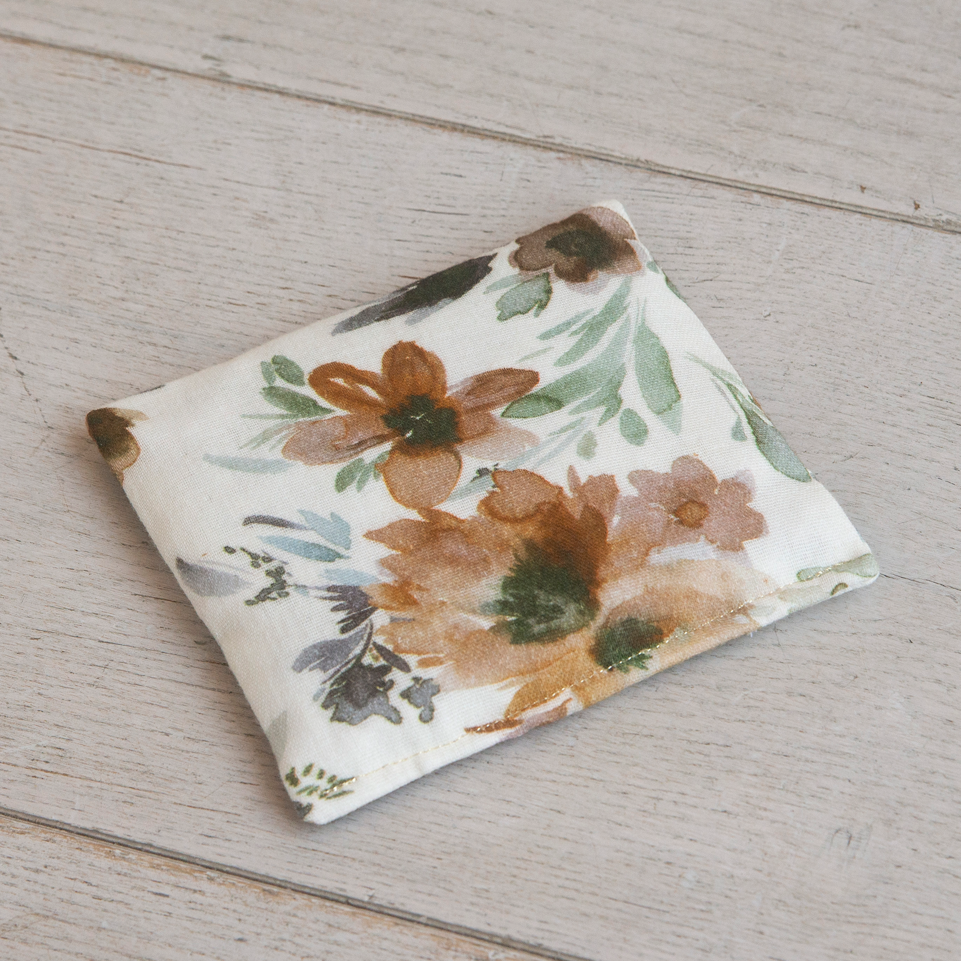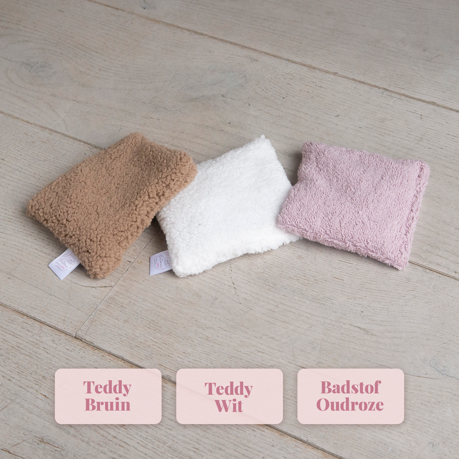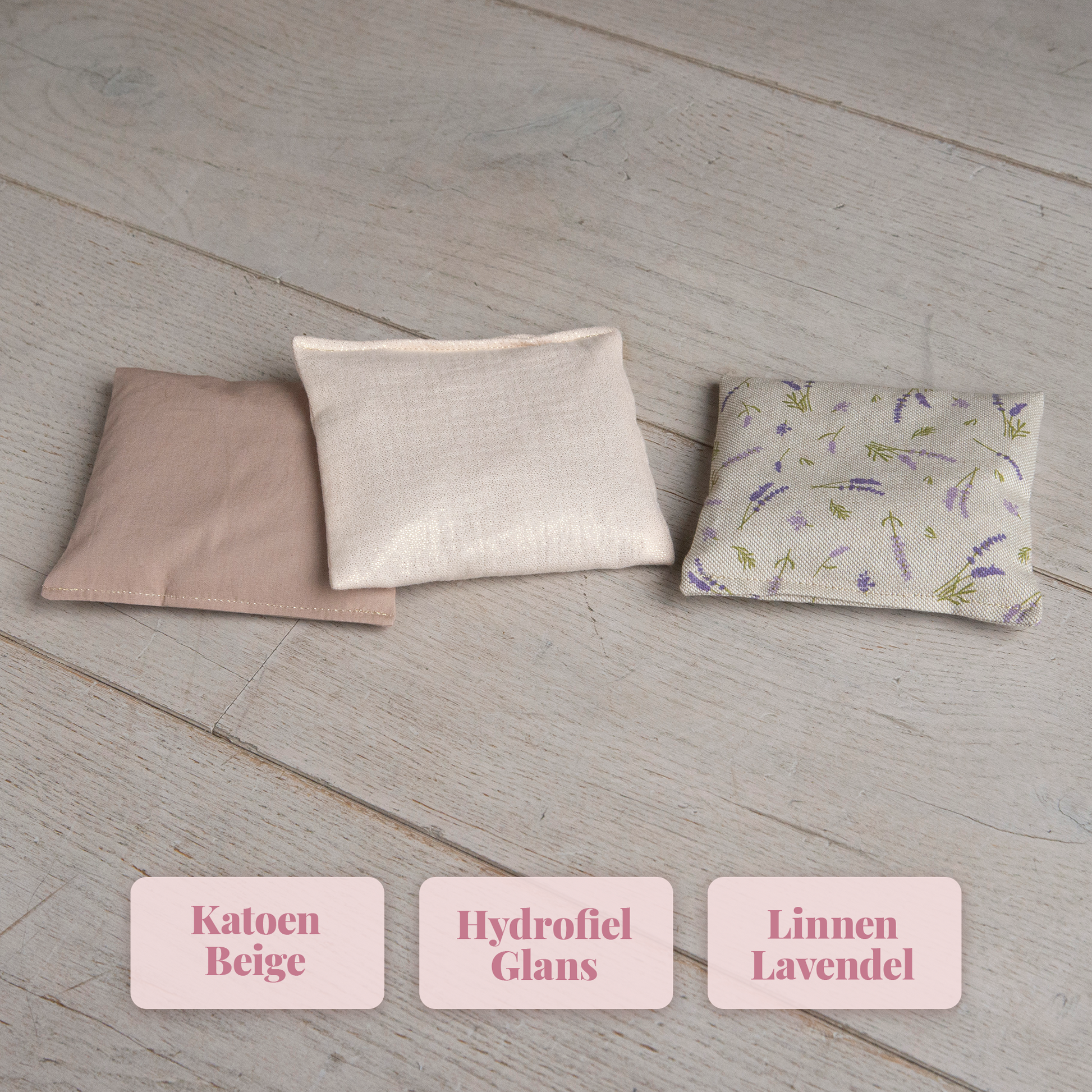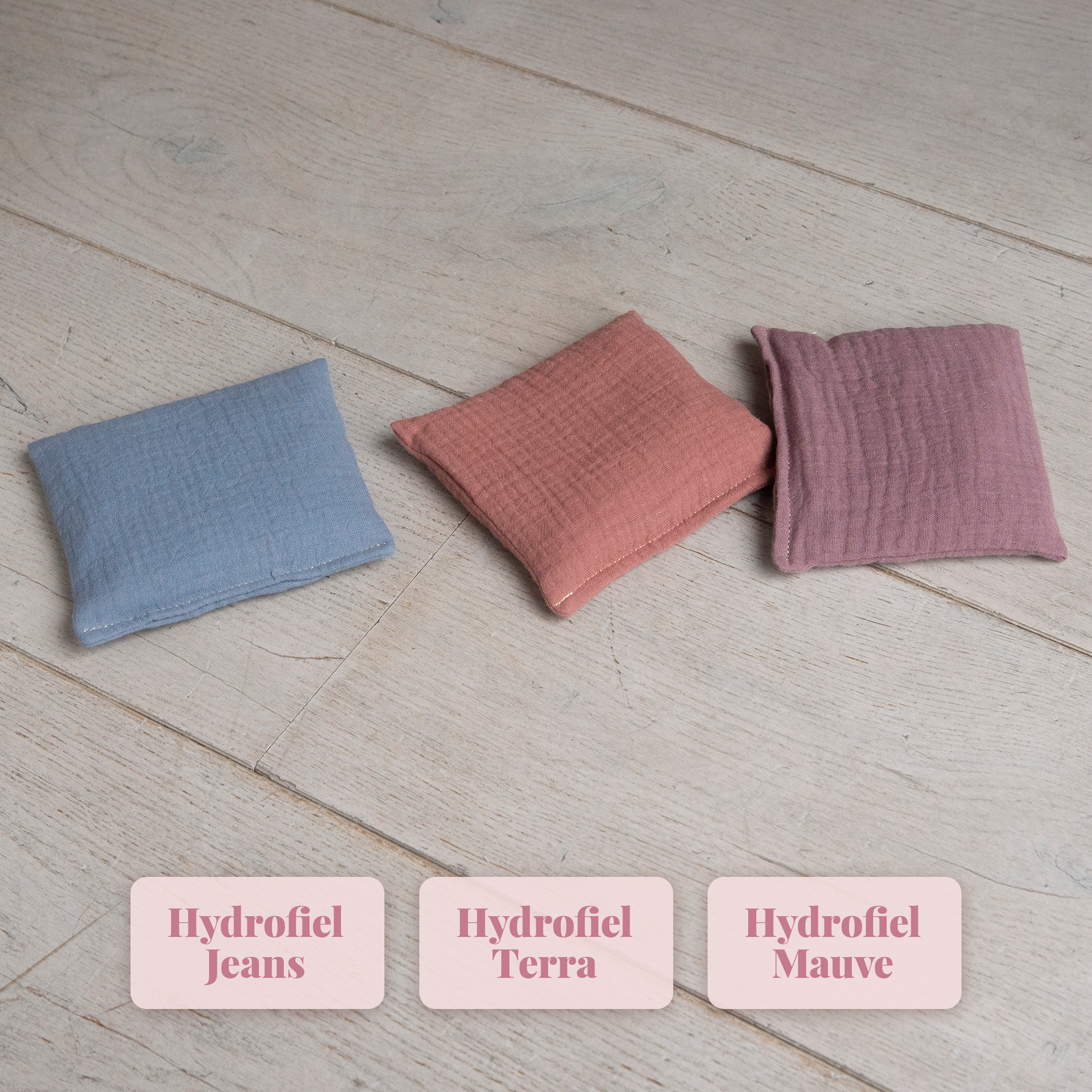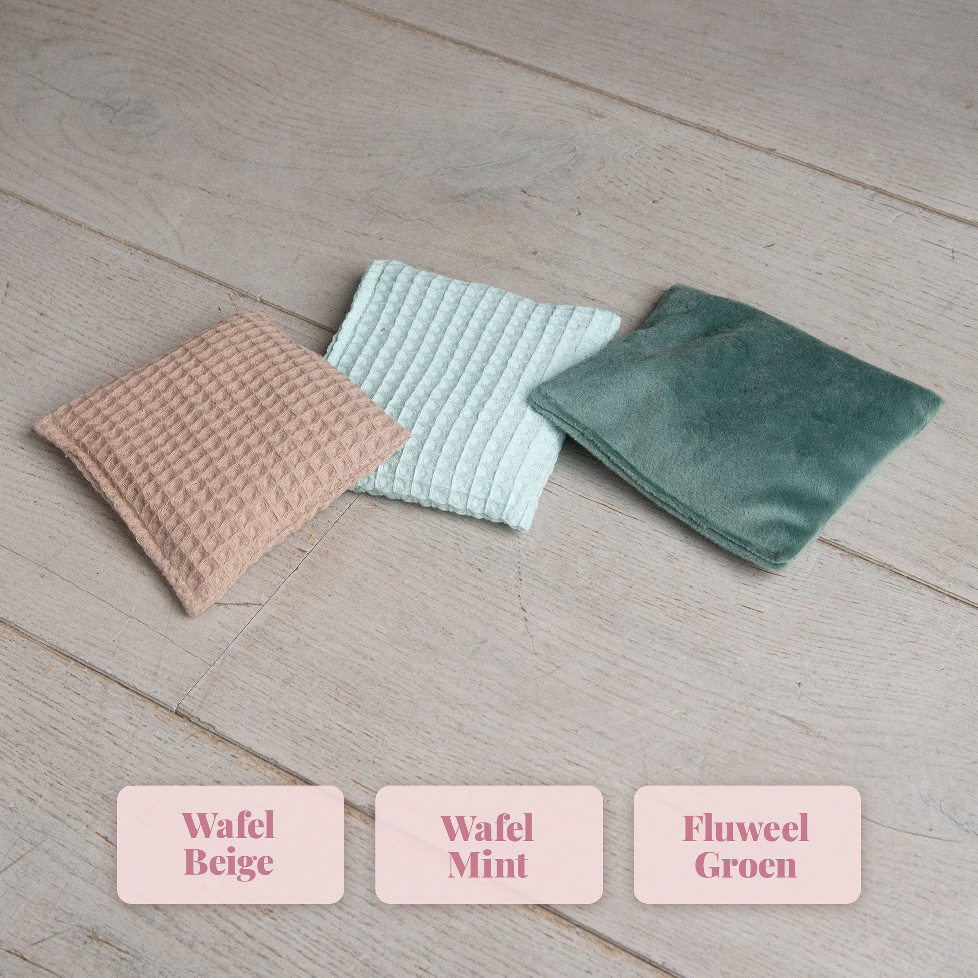 Omdat er al genoeg plastic op deze wereld is, vul ik mijn pittenzakjes met natuurlijke materialen, namelijk kersen-, druivenpitten en een mix daarvan. Voor de stoffen heb ik gekozen voor verschillende texturen en rustige botanische prints in aardetinten. Alle stoffen zijn voorzien van een OEKO-TEX keurmerk.